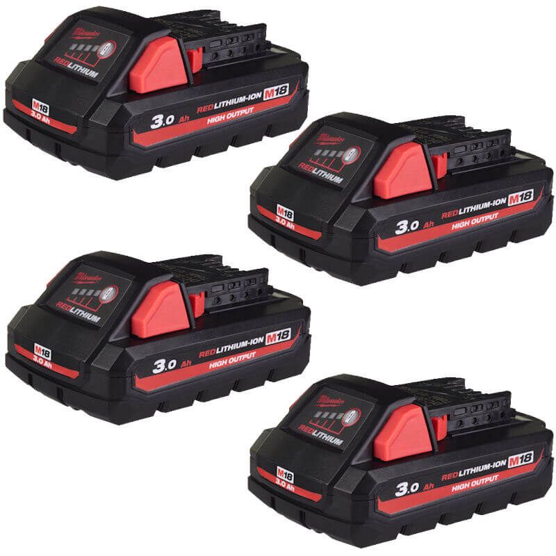 MILWAUKEE 4X M18HB3 M18 3.0AH HIGH OUTPUT RED LITHIUM-ION BATTERIES